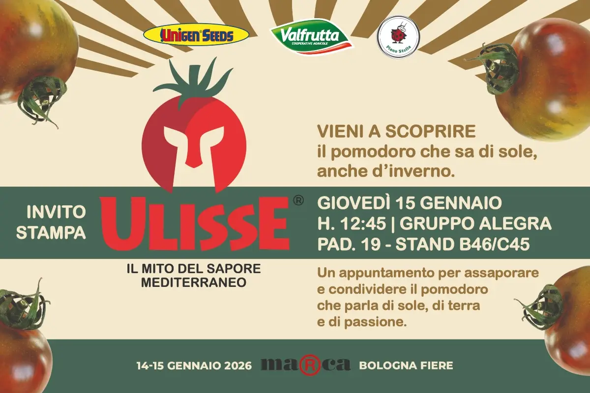 Marca 2026 sarà il palcoscenico per la presentazione di Ulisse, il nuovo pomodoro del Gruppo Alegra, che sarà commercializzato con il marchio Valfrutta Fresco. L'evento offrirà la possibilità di scoprire il prodotto (sviluppato insieme a Unigen Seeds e alla cooperativa Piano Stella), assaporarlo in un momento di assaggio riservato alla stampa e confrontarsi con i manager del gruppo su posizionamento e  strategia di commercializzazione.