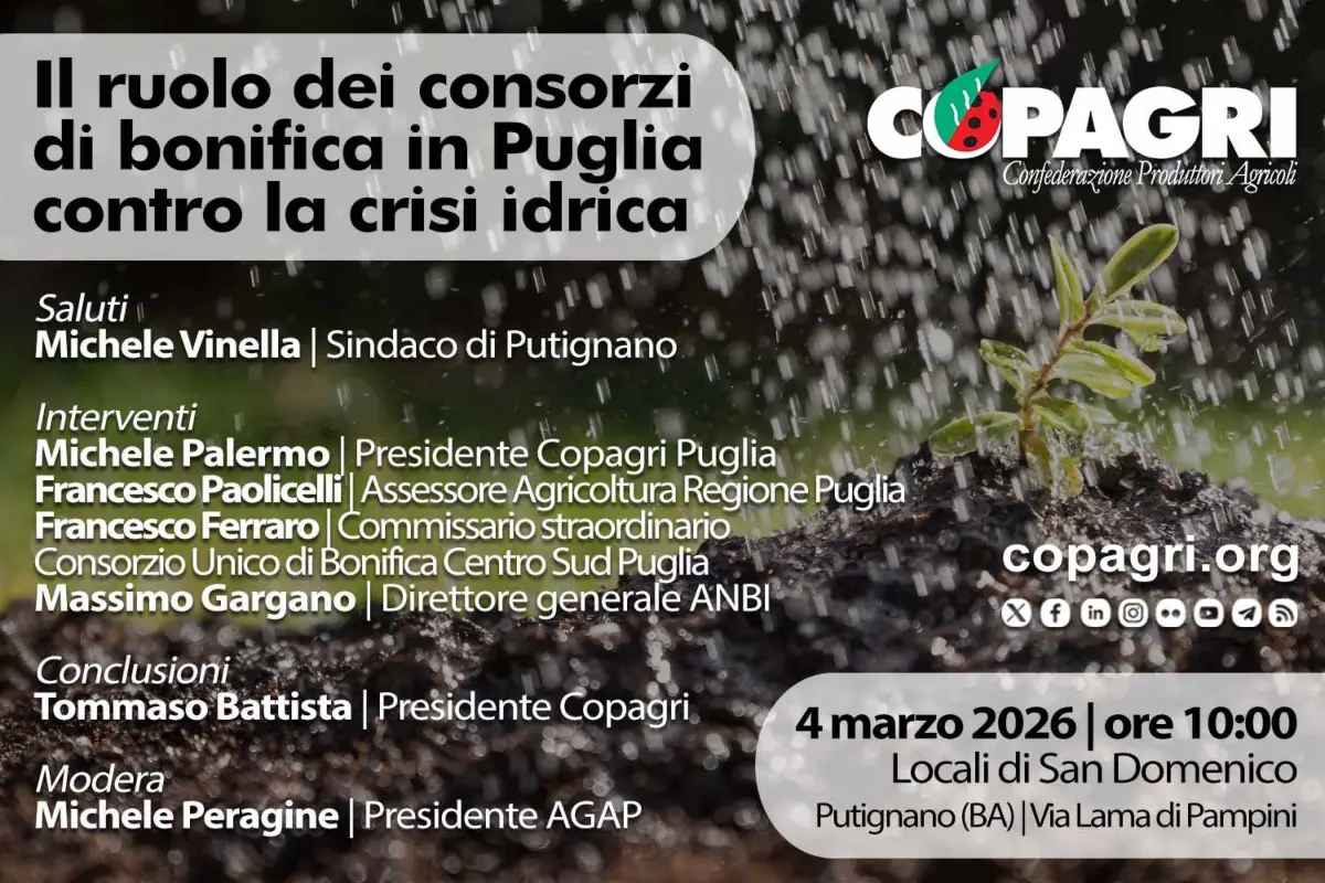 “La mancanza di manutenzione si ripercuote anche sulla quotidianità dei cittadini, sia in termini di viabilità nelle zone rurali che soprattutto di utilizzo e disponibilità della risorsa idrica, condizione a sua volta fondamentale, unitamente alla gestione della risorsa idrica e alla capacità di irrigazione, per la sicurezza alimentare e la disponibilità di cibo”, aggiunge Battista, informando che ai lavori interverranno, fra gli altri, l’assessore all’agricoltura della Regione Puglia Francesco Paolicelli, il commissario straordinario del Consorzio Unico di Bonifica Centro Sud Puglia Francesco Ferraro, il direttore generale dell’AnbiI Massimo Gargano e il presidente della Copagri Puglia Michele Palermo.