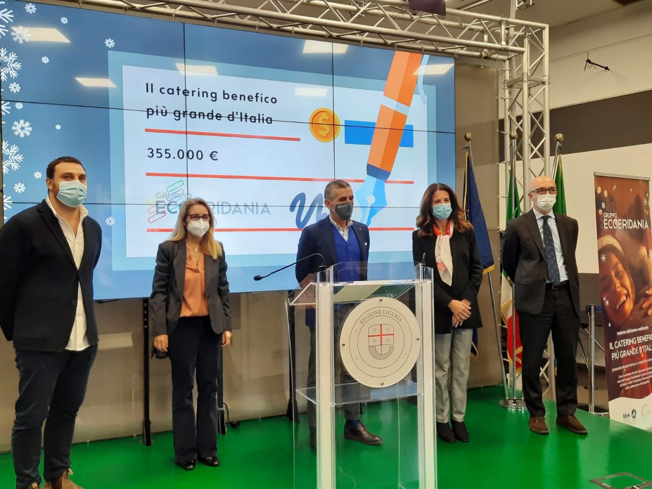La presentazione dell'iniziativa benefica di EcoEridania con Nicola Farinetti (primo a sinistra), Andrea Giustini (al centro), Ilaria Cavo (quarta da sinistra)