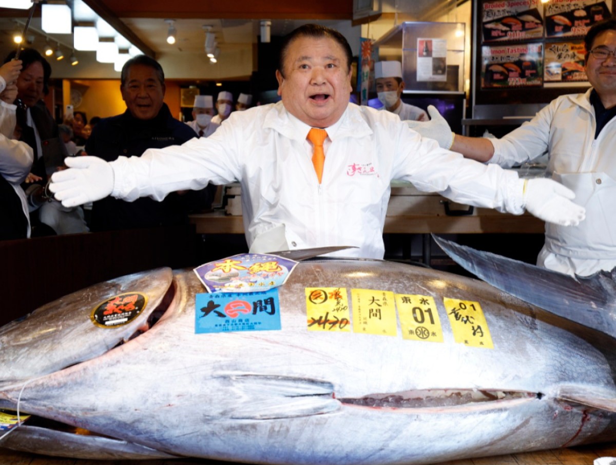 Kiyoshi Kimura, presidente della catena giapponese di sushi Sushi-Zanmai con il tonno rosso di 243 chili che ha venduto all'asta al prezzo record di 510,3 milioni di yen (circa 2,8 milioni di euro) presso il ristorante principale della catena di sushi a Tsukiji a Tokyo, Giappone, 05 gennaio 2026
