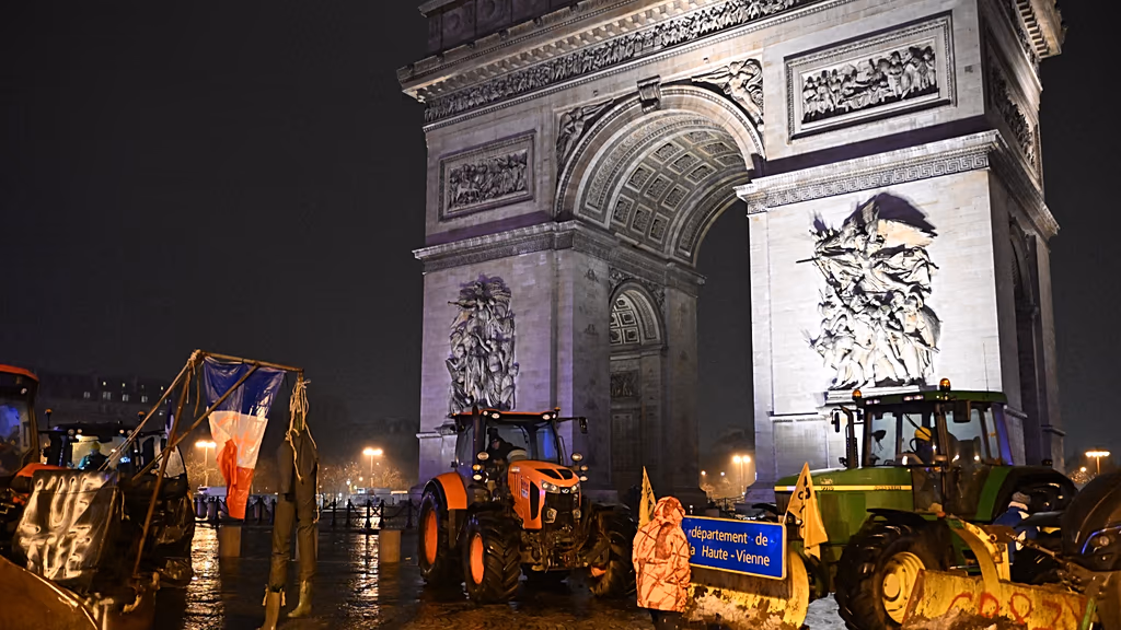 Agricoltori con trattori in rivolta a Parigi 8 gennaio 2026