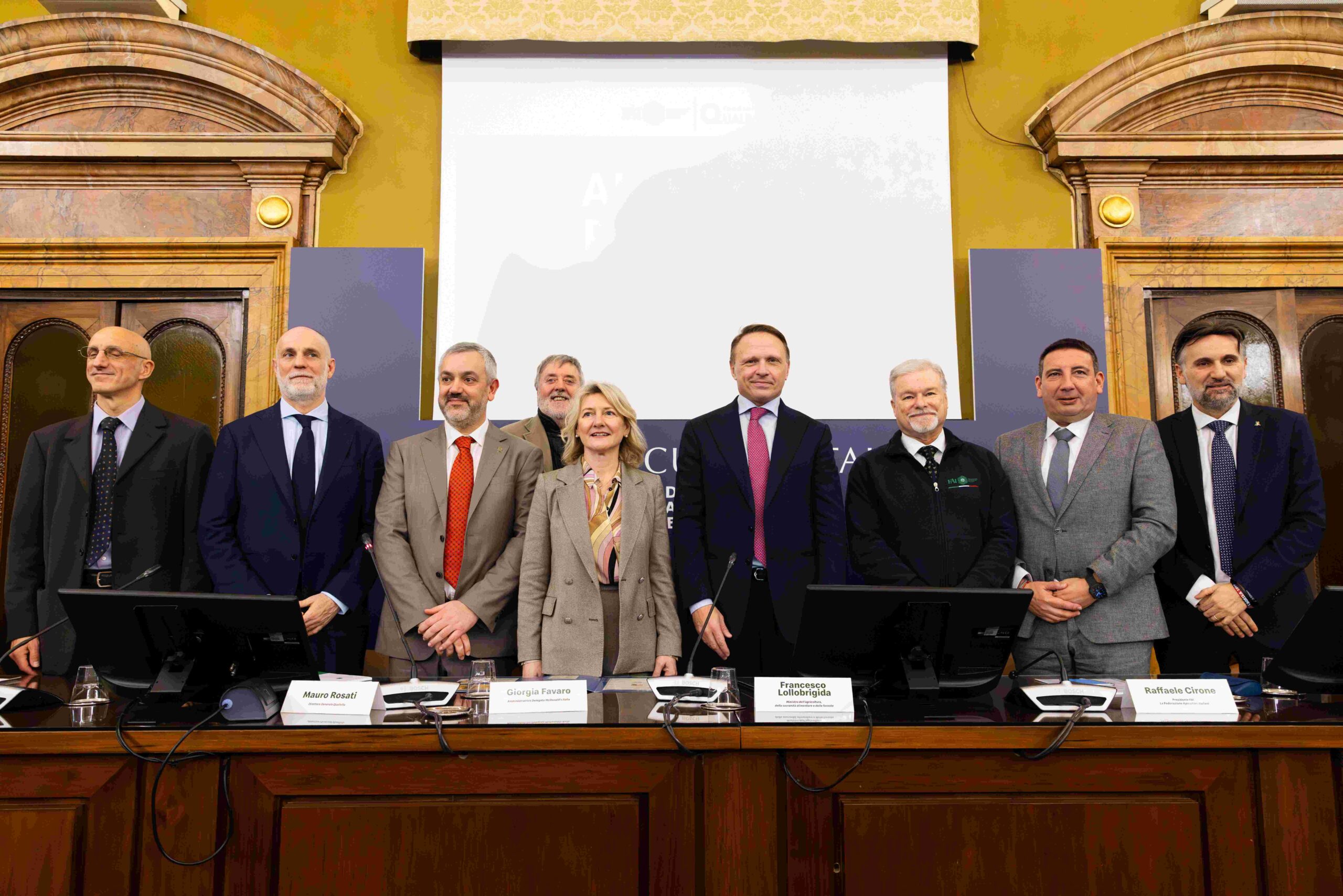 Masaf, presentazione Progetto Miele McDonalds, Fondazione Qualivita e Fai-Federazione apicoltori italiani. da sin. Giuseppe Lucano (dir. marketing Consorzio tutela miele della Lunigiana dop), Mauro Rosati (dir. generale di Qualivita),Emilio Ballinari (Presidente CQMV Miele Varesino dop), Mario Burlon (Consorzio di tutela miele delle Dolomiti Bellunesi dop), Giorgia Favaro (Ad McDonald's Italia), Francesco Lollobrigida (Ministro del Masaf), Raffaele Cirone (Presidente Federazione apicoltori Italiani), Guido Liris (senatore), Etelwardo Sigismondi (senatore)