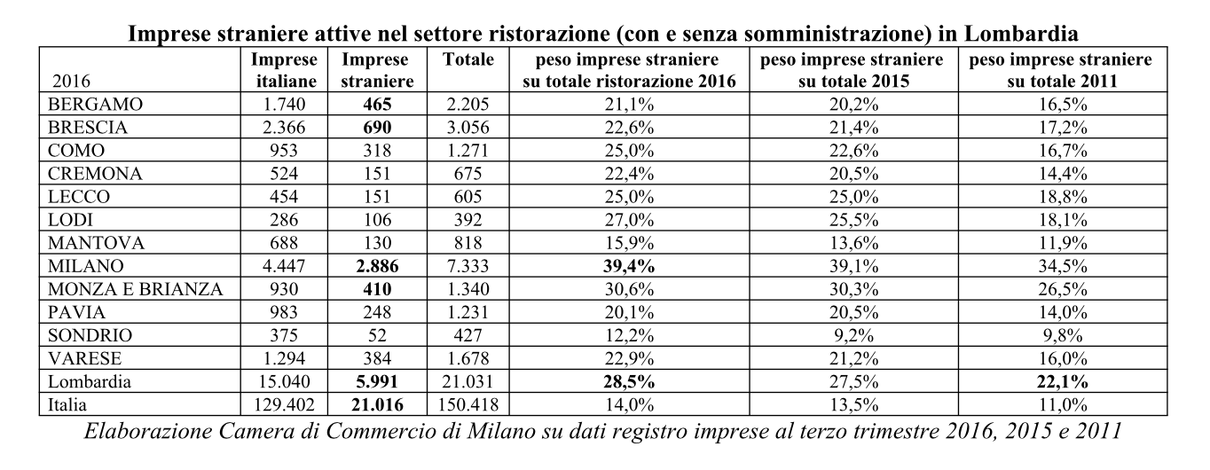 Imprese straniere attive nel settore ristorazione (con e senza somministrazione) in Lombardia