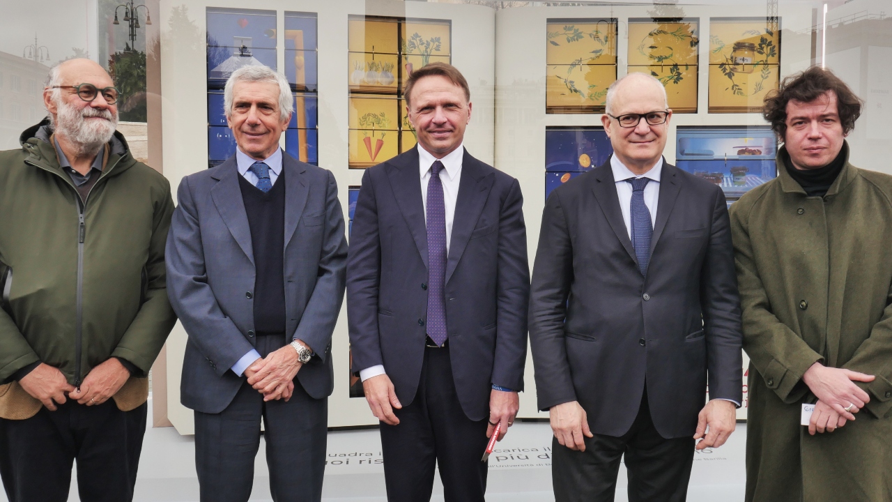 Inaugurazione Libro del Risparmio itinerante. Da sinistra: Riccardo Valentini, Paolo Barilla, Francesco Lollobrigida, Roberto Gualtieri, Virgilio Villoresi (Roma, piazza del Popolo, 3 febbraio 2026)