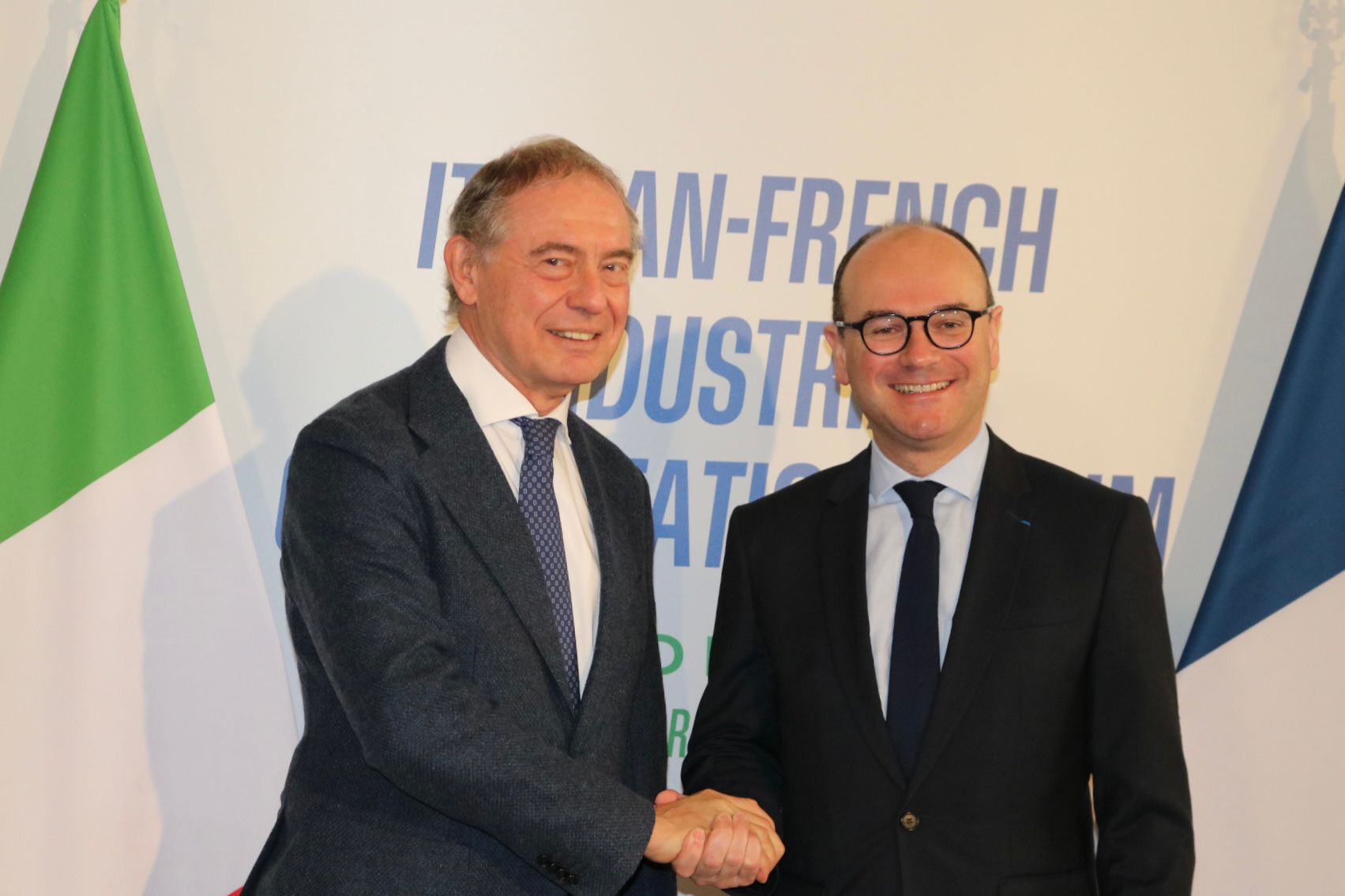 Terzo forum Italia Francia a Roma: a sinistra il ministro delle Imprese e made in Italy, Adolfo Urso, a destra l'omologo francese Sébastien Martin