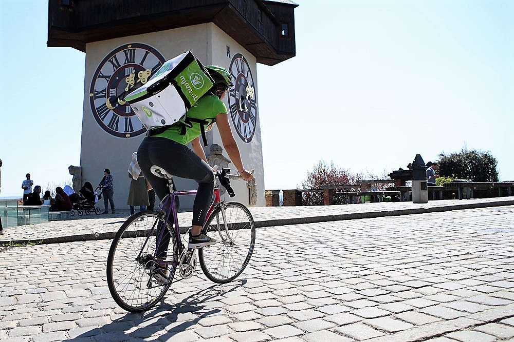 Fattorino ciclista effettua consegne di cibo per Mjam