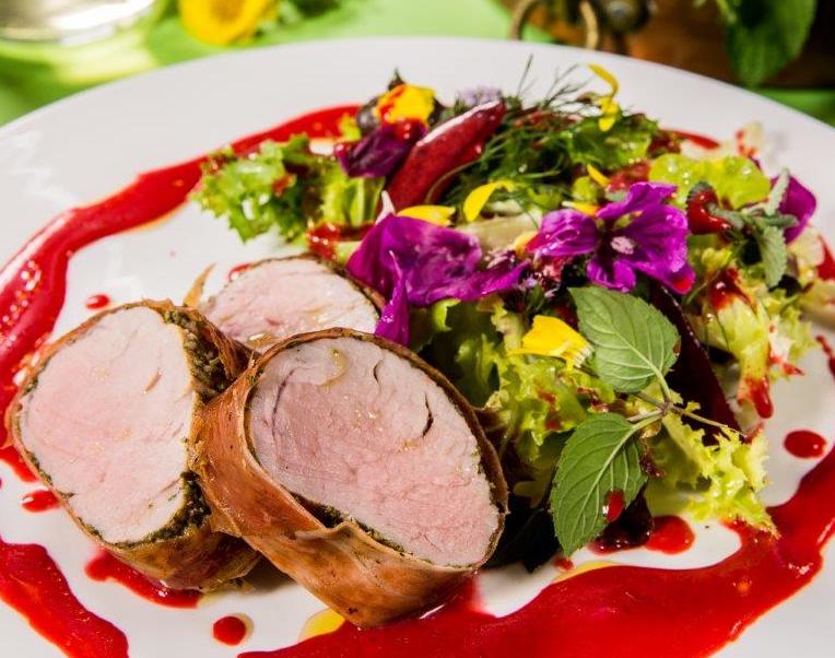 Filetto di maiale, misticanza e susine
