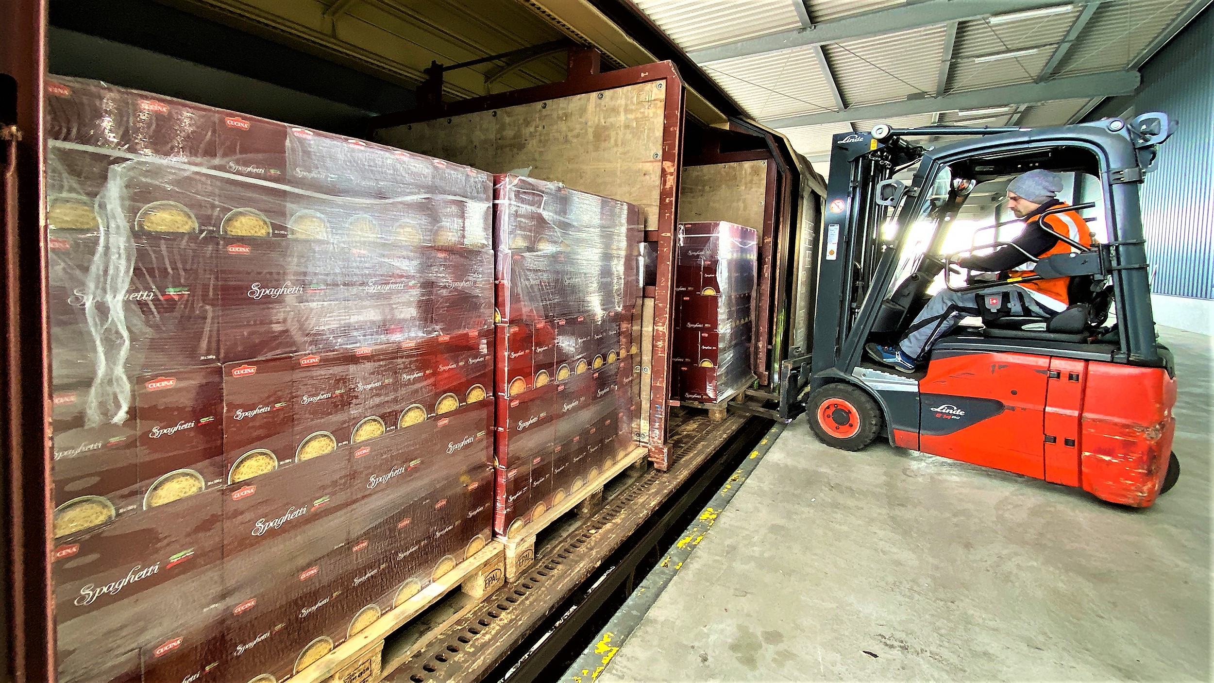 Uscita da un pastificio di Nola, Napoli, la pasta destinata ai supermercati Aldi in Germania, viene trasportata su camion fino al Nord Italia, e qui viene caricata su treni (vedi foto), destinazione Norimberga
