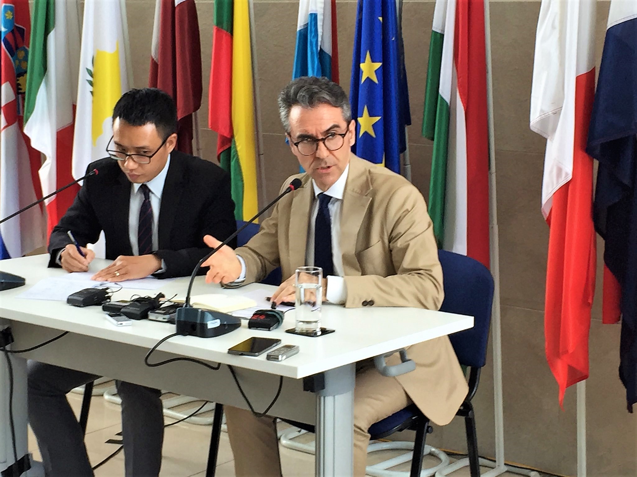 L'ambasciatore italiano ad Hanoi Giorgio Aliberti durante il briefing con la stampa seguito alla ratifica da parte dei deputati all'Assemblea nazionale, dell'European Union Vietnam Free Trade Agreement, Evfta, l'accordo di libero scambio Ue-Vietnam